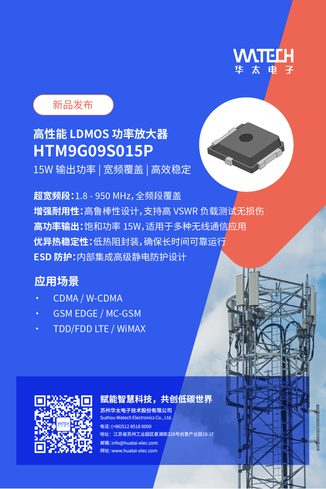 華太電子全新推出的 HTM9GO9S015P 和 H9G3438M15P 兩款 LDMOS 放大器,分別覆蓋 1.8 - 950 MHz 和 3.4 - 3.8 GHz 的頻段,均提供 15W 的輸出功率。這兩款產(chǎn)品憑借其高效、穩(wěn)定的性能,為 5G 和無線通信應(yīng)用提供了強大的技術(shù)支持。